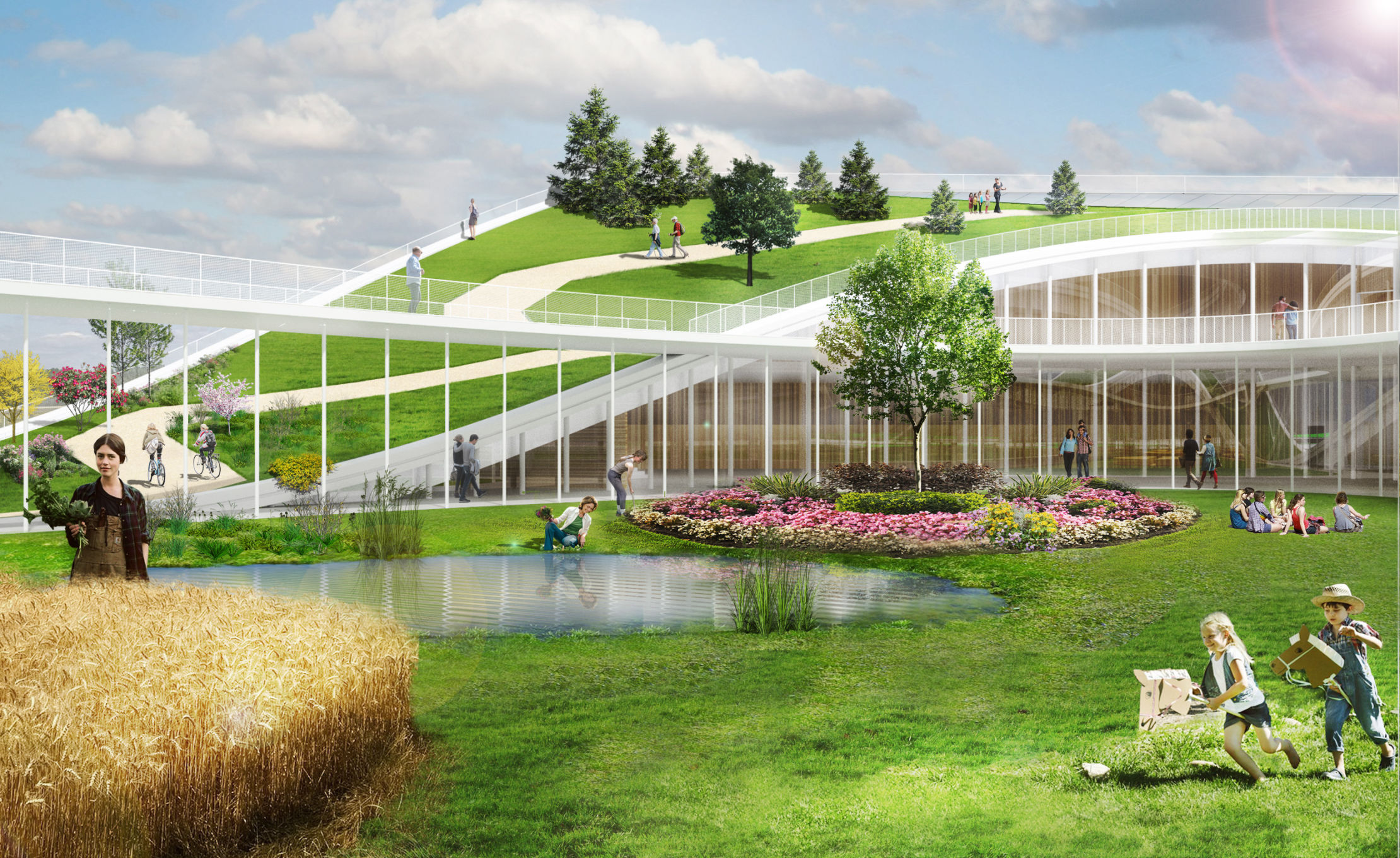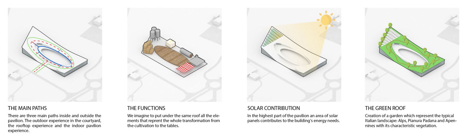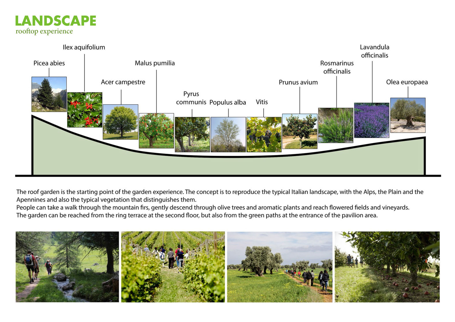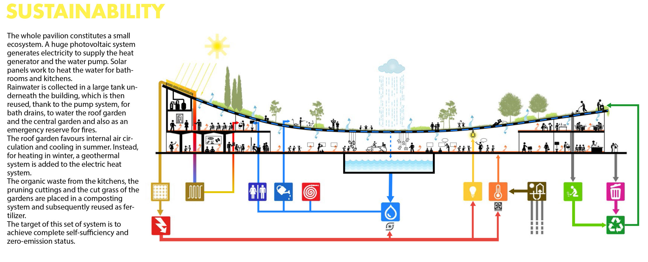The pavilion is conceived as a ring building with a roof garden and a cultivation place in the central court. This choice is due to the will to place the experience