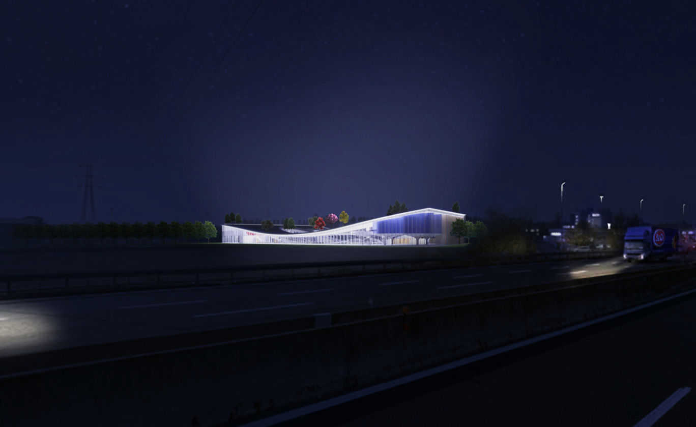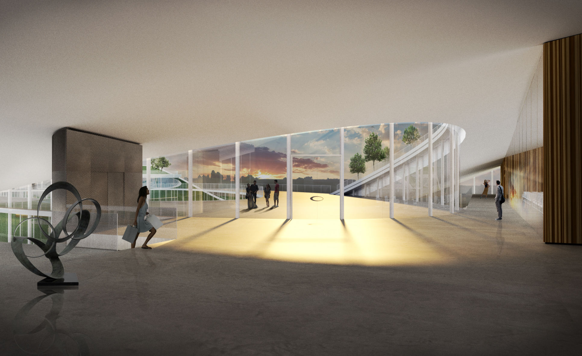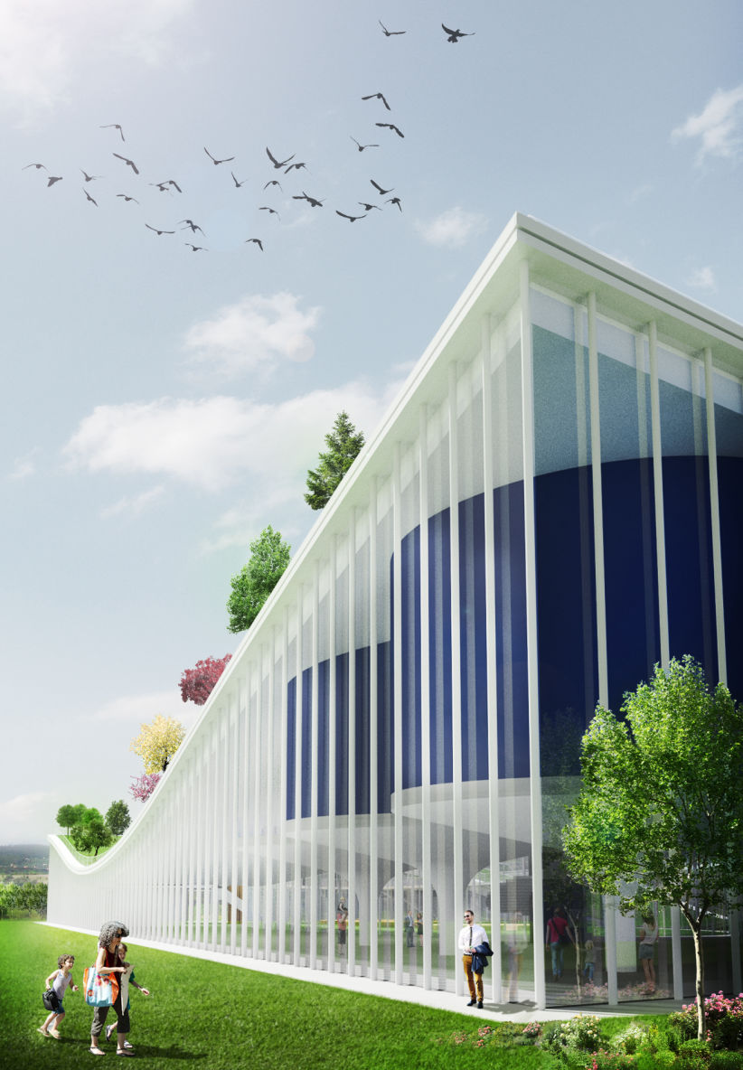 The pavilion is conceived as a ring building with a roof garden and a cultivation place in the central court. This choice is due to the will to place the experience
